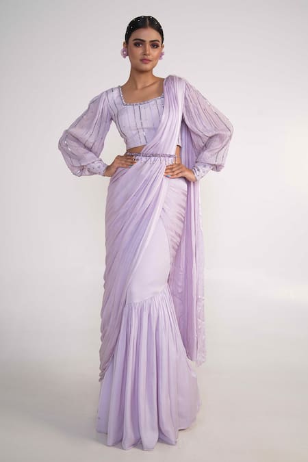 Lavender pre-draped saree in modal satin & silk blend with a detachable pallu. Paired with a chiffon blouse featuring sequins and salli embroidery, and a belt.