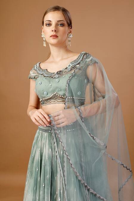 Buy_Merge Design_Green Net, Georgette, Organza Pearls, Mirrors, Stones, Tie Dye Lehenga Set _Online_at_Aza_Fashions
