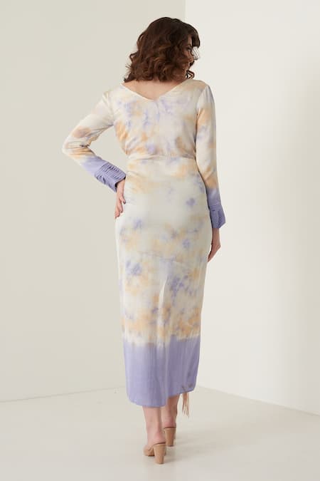 Lavender tie dye ombre shift dress with a front slit, pink fringes & braided embroidered attachment.