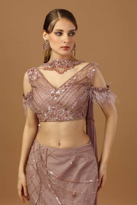 Dusty rose lehenga featuring tonal linear pattern embroidery and a fish cut design. Paired with a cold shoulder blouse and a tasseled choker dupatta.