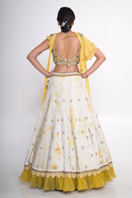 White velvet lehenga featuring a tie-dye pattern and pleated hem border with lace and tassel detailing. Paired with a yellow padded blouse with ruffled asymmetric sleeves and a chiffon choker dupatta.