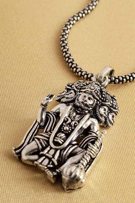 92.5 silver toned pendant necklace featuring a 3D carved Panchmukhi Hanuman. The necklace measures 20 inches in length with a pendant size of 1.5 x 1 inches.