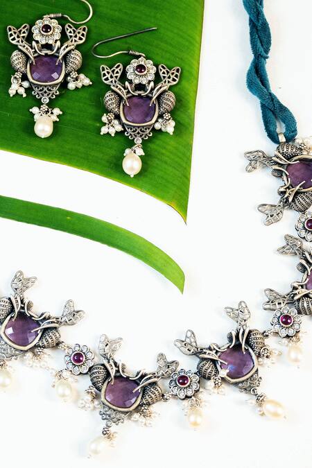 Purple Applique, Stones Amethyst Embellished Tribal Necklace Set