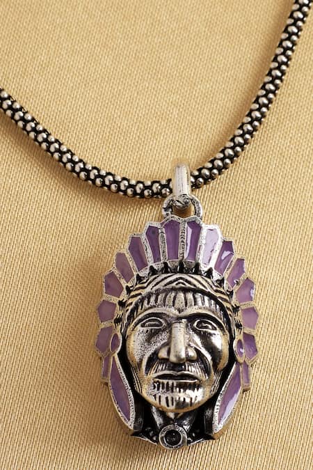 Purple stone work pendant necklace featuring an Anglo Indian carved design. The necklace is made of 92.5 silver with a lobster clasp closure.