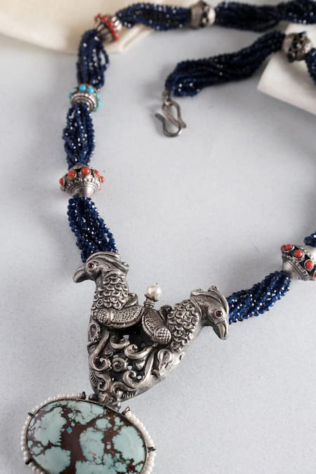 Silver long pendant necklace featuring a carved bird design, embellished with turquoise stones and beads