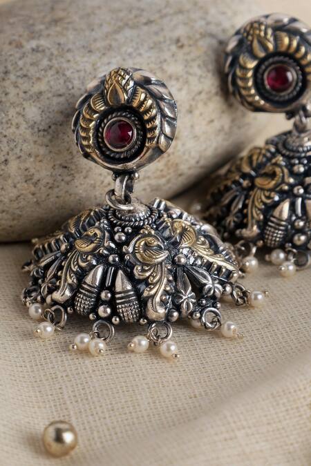 Dual toned temple carved jhumkis featuring red kemp stone embellishment and pearl drops. Handmade with dimensions of 2.5 x 1.5 inches and a push back clasp closure.