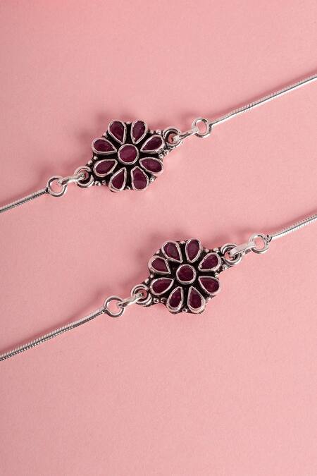 92.5 silver anklet set featuring floral carvings adorned with ruby pink kundan and cubic zirconia embellishments. The set includes two matching anklets designed for comfort and elegance.