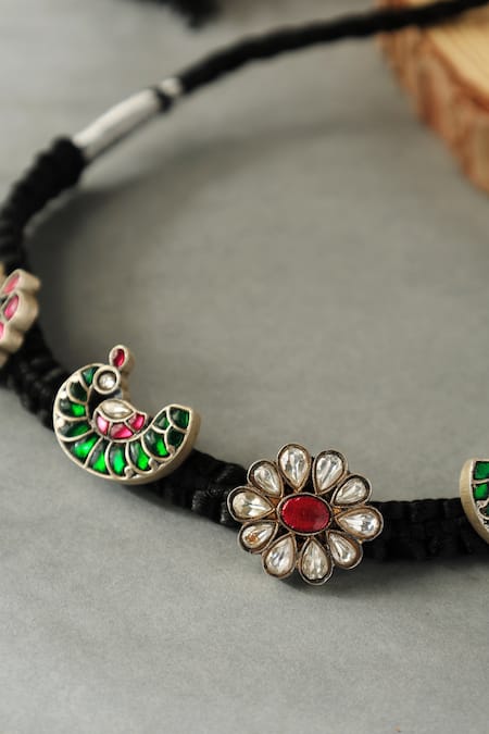Green choker featuring geometric floral motif with kundan embellishments. Handmade with 92.5 silver and adjustable dori closure.