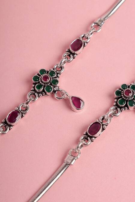 Buy_Mero Jewellery_Silver Plated Stones Floral Embellished Anklet Set_at_Aza_Fashions