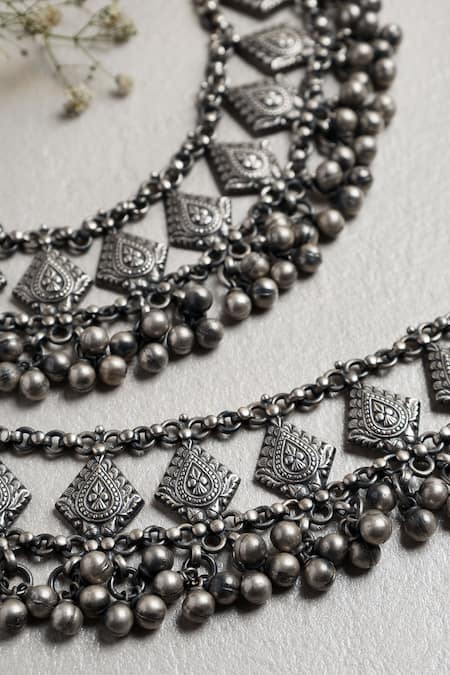 Set of 2 anklets featuring geometric carvings and ghungroo drops. Each anklet is handmade from 92.5 silver with a hook closure.