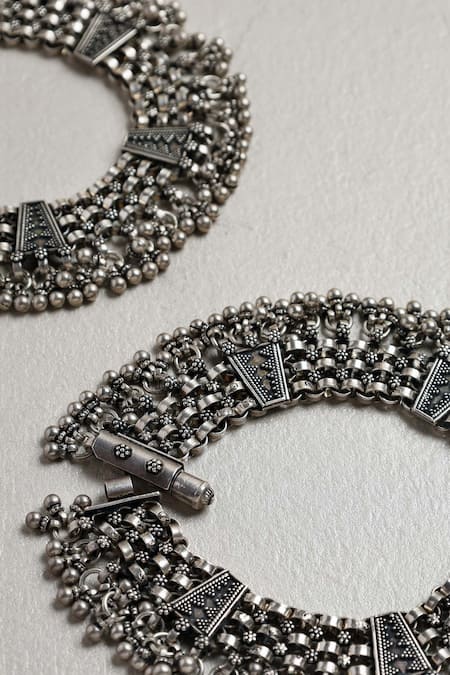 Silver anklet set featuring ghungroo drops and geometric carvings. Handmade with a hook closure for secure wear.