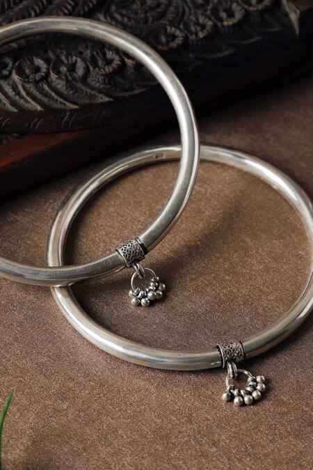 Silver leg kada set featuring ghunghroo details. Each kada is handmade with a diameter of 3 inches and a width of 0.5 inches.