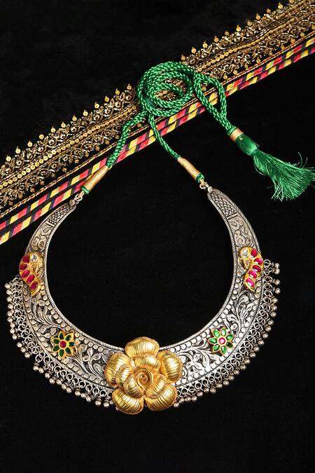Kundan embellished hasli necklace featuring floral & bird motifs with carved base