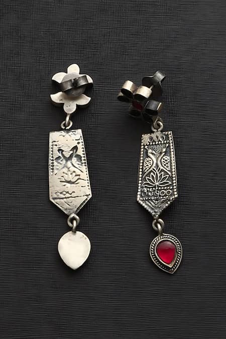Floral motif studded with green kundan, Carved patterns with intricate detailing, Drop motif with red stone accent