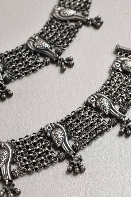 Set of 2 anklets featuring peacock carved detailing and ghungroo drops. Crafted from 92.5 silver, these anklets have a hook closure for secure wear.