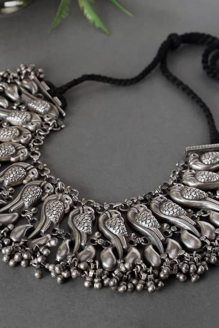 Silver necklace featuring carved peacock motifs and ghunghroo tassels