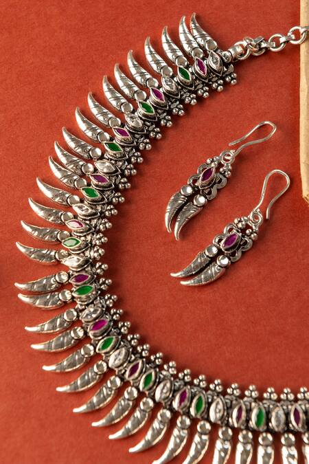 Silver necklace featuring geometric carved detailing with onyx, ruby, and pearl embellishments. Paired with matching earrings that have a push back clasp closure.