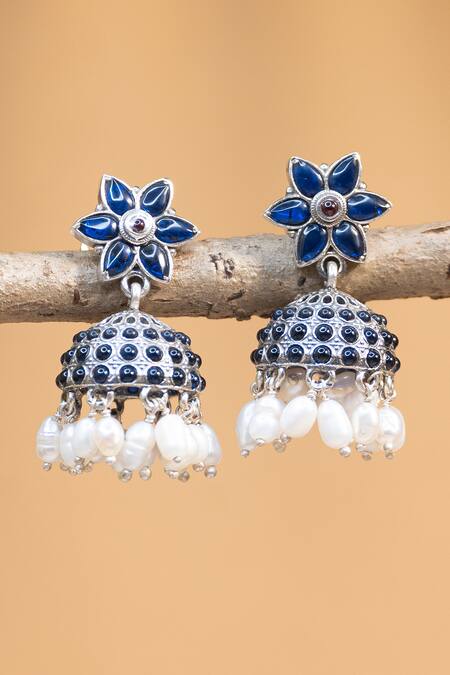 92.5 silver toned floral shaped jhumkas featuring blue kempstone embellishment and pearl drops. Handmade with dimensions of 1.5 x 0.5 inches and a push back clasp closure.
