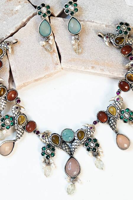 Multi Color Stones Tribal Peacock Carved Necklace Set