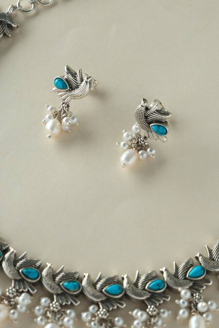 Turquoise silver necklace featuring bird motifs and pearl embellishments. Paired with matching earrings adorned with turquoise and pearls.