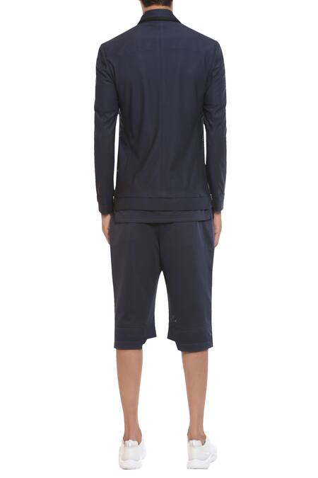 Unapologetic fashion in a rugged athleisure theme defines the aesthetics of this poly-mesh midnight blue suit. It features an off-duty blazer jacket teamed up with cropped jogger pants and an inner shirt.