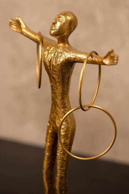 Gold metallic human sculpture with holding rings in arm with circular shaped marble base.