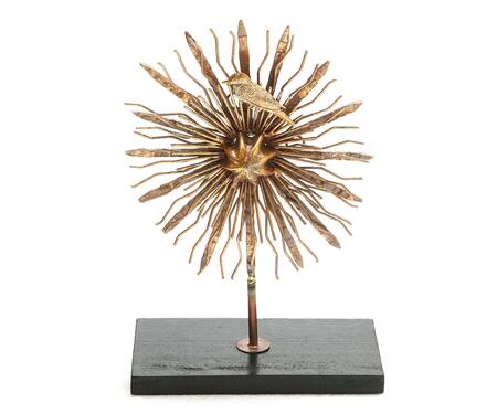 Copper table decor in a tree shape with bird detail on top and a black base.