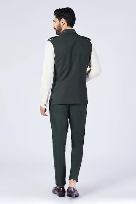 Military green waistcoat featuring metallic buttons and a Nehruvian collar with faux leather details