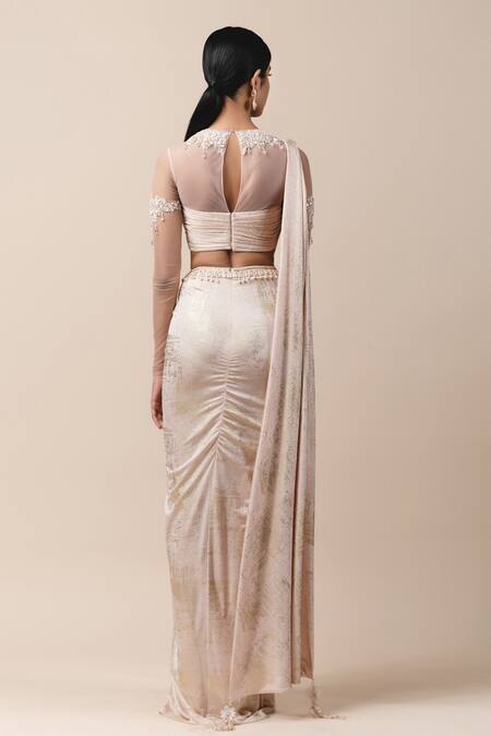 Blush pre-stitched foil jersey metallic saree with dori work & bead tassel belt detail. Comes with draped blouse enhanced with pearl & stone embellishments.