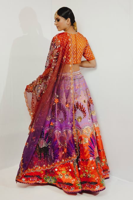 Orange to lilac ombre shaded lehenga with metallic embroidery & cheetah print. Paired with blouse & dupatta.