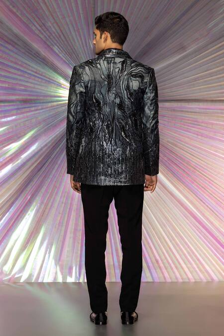 Black hand embroidered tuxedo in moulded metallic polymer, cords & glass beads. Paired with shirt & tapered pant.