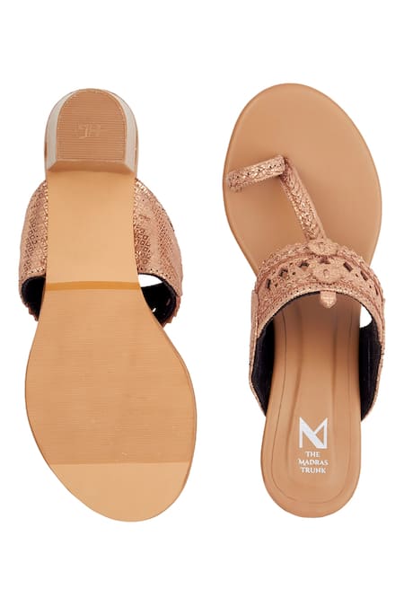 Rose gold Kolhapuri block heels featuring a toe ring, braided detail, and laser cutwork border