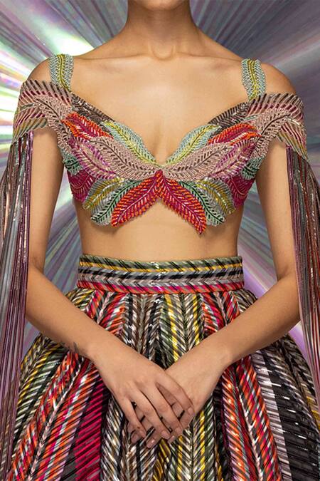 Multicolored starburst lehenga with metallic stripes. Paired with hand embroidered blouse in beads, yarns & drape.