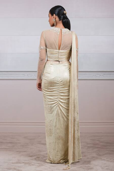 Gold metallic foil jersey pre-draped saree with dori belt. Paired with drape blouse embellished with pearl & stone embroidery on neck & bajubandh.