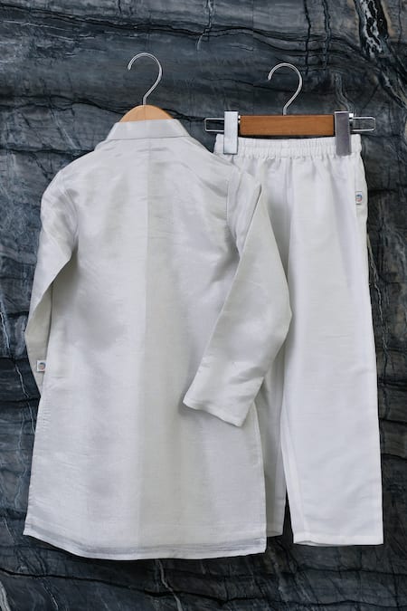 A silver pure tissue kurta is lined with Ahimsa silk and features constellation embroidery. It is paired with ivory Ahimsa silk pyjama pants.