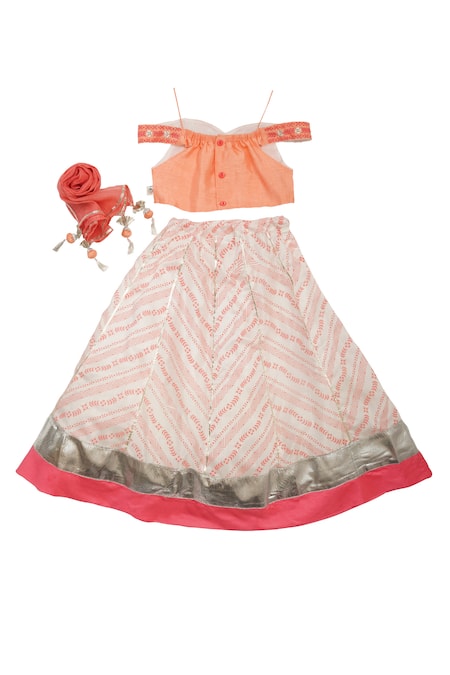 Peach lehenga featuring floral chevron print with gotapatti borders. Accompanied by a matching embroidered blouse and dupatta.