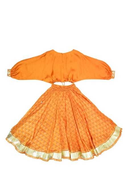 Orange lehenga featuring floral print with gotapatti borders. Paired with a matching mirrorwork blouse with a round neckline and puff sleeves.