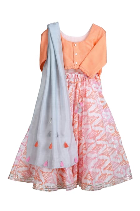 Peach lehenga featuring all-over prints and gota patti trim at the hem. Accompanied by a blouse with embroidered back and a dupatta with tassels.