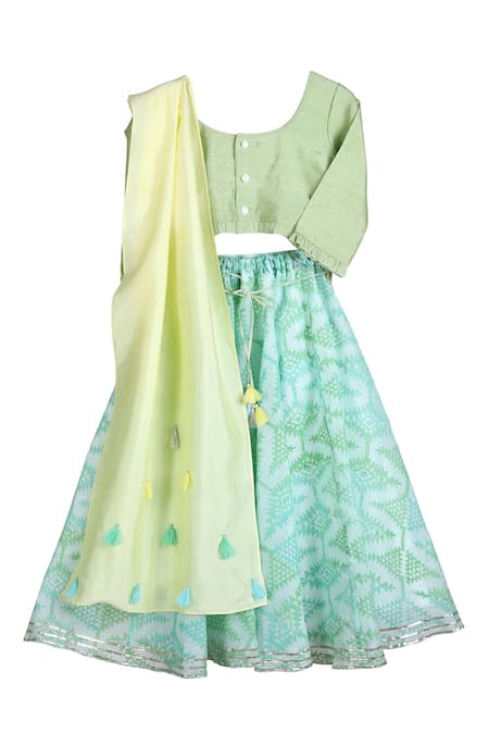 Mint green lehenga featuring all-over prints and gota patti trim at the hem. Paired with a blouse that has an embroidered back and a dupatta adorned with tassels.