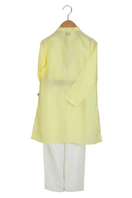 Yellow kurta featuring mirror embroidery on the placket and a mandarin collar. Paired with matching pants for a complete look.
