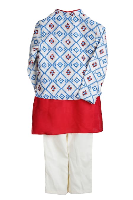 Red kurta set featuring a band neckline and full sleeves. Paired with an off-white nehru jacket adorned with geometric print and side slits.