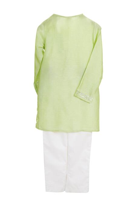 Green kurta featuring round neckline and full sleeves with gota placement embellishment. Paired with ivory pants, this set is made from handwoven Chanderi and 100% organic cotton.