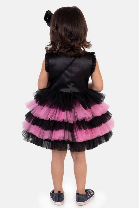 Black dress featuring a floral print bodice and a tiered ruffle skirt in alternating pink and black layers