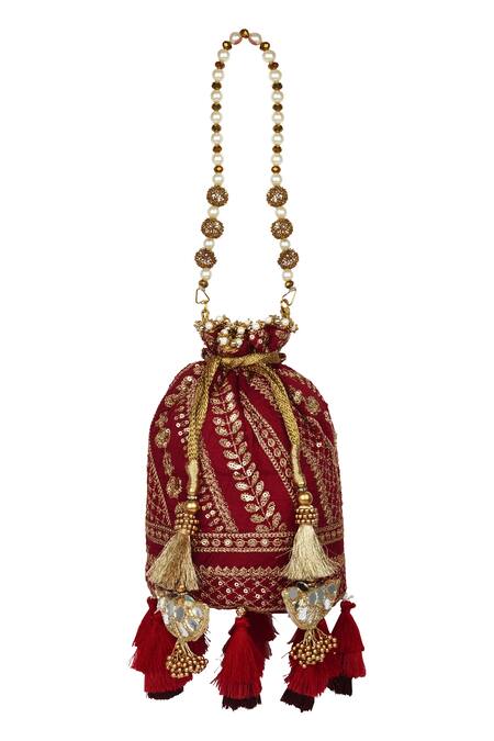 Red silk potli bag featuring intricate hand embroidery with sequins and zari