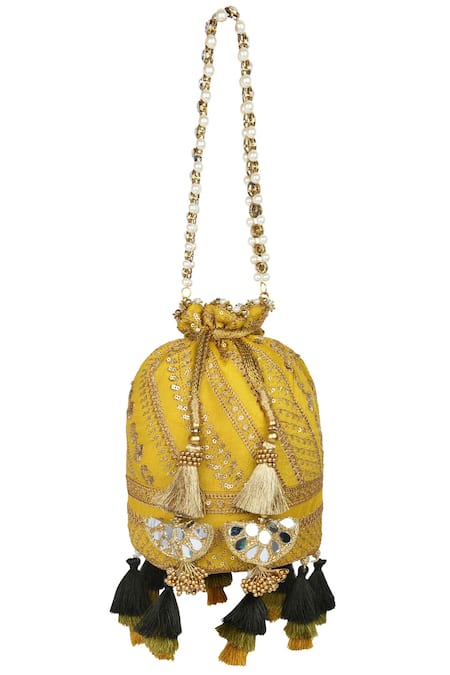 Yellow silk potli bag featuring intricate sequin and zari hand embroidery