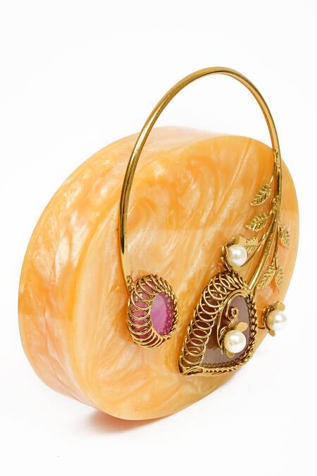 Yellow oval resin box clutch featuring an abstract pattern and a floral metallic carved handle