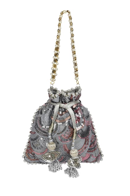 Grey potli bag featuring hand embroidery with sequins, pearls, and beads