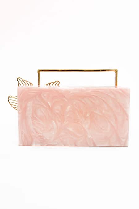 Light pink resin box clutch featuring an abstract pattern with a metallic geometric and floral shaped carved handle