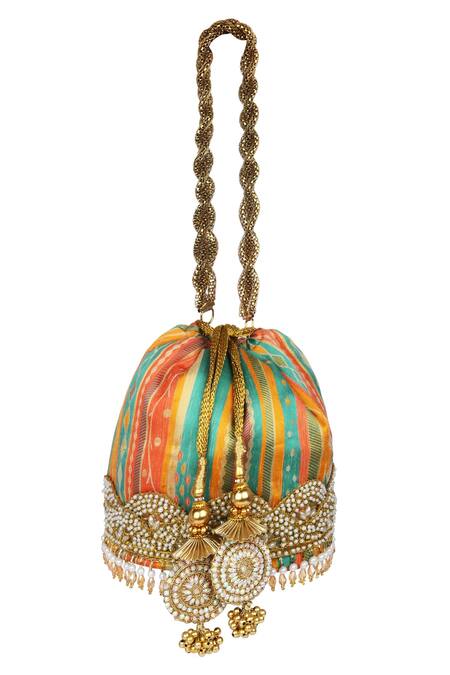 Multi color potli bag crafted from raw silk featuring a contrast stripe pattern and scalloped pearl embellished lace