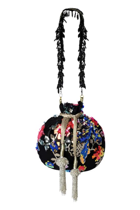 Black potli bag featuring floral pattern with hand-embroidered sequins and rhinestones